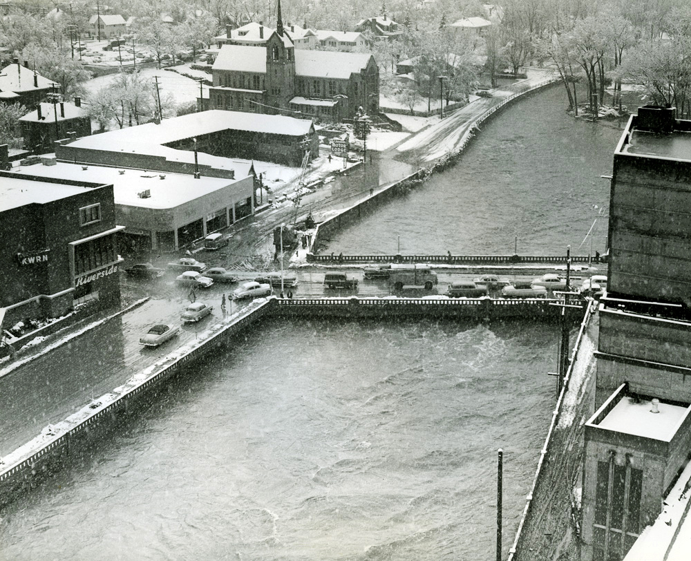 The location, so close to the river, was disadvantageous in the flood of 1955. Sandbags did not prevent the crypt from being filled with water. The high water marks can still be seen on the interior walls. The 1950 addition to the Riverside Hotel can be seen at the left of the frame.