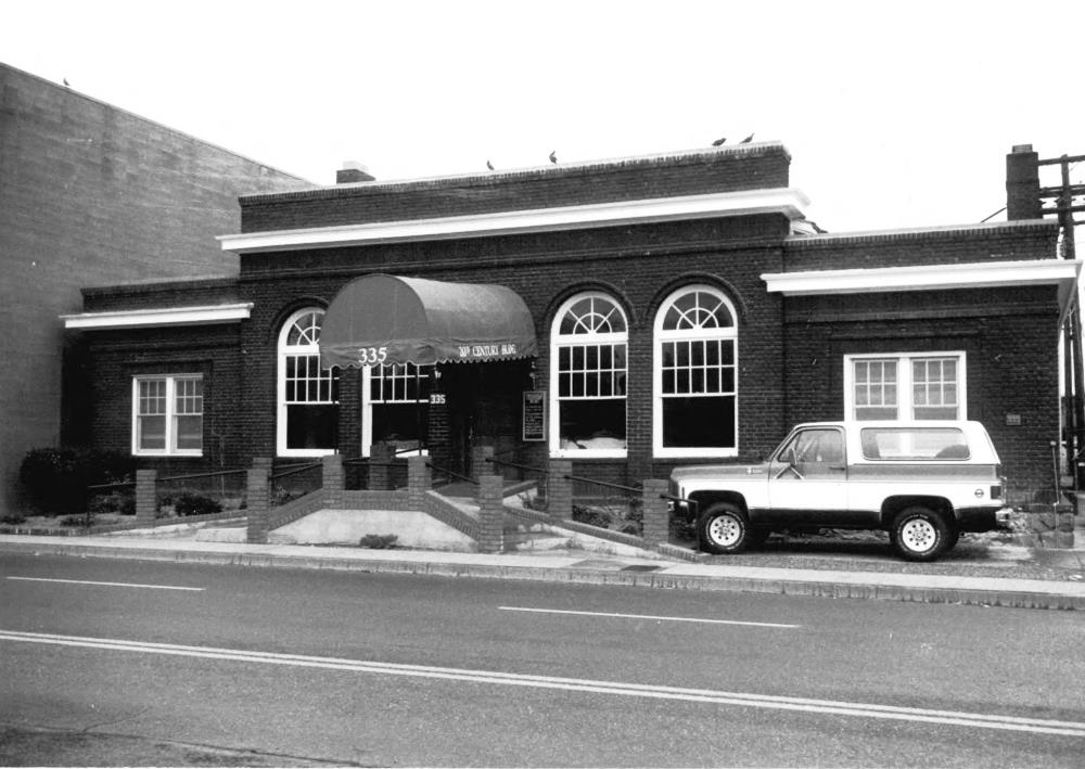 The clubhouse is pictured upon its nomination to the National Register in 1982. The front entrance ramp and door are not original to the structure.