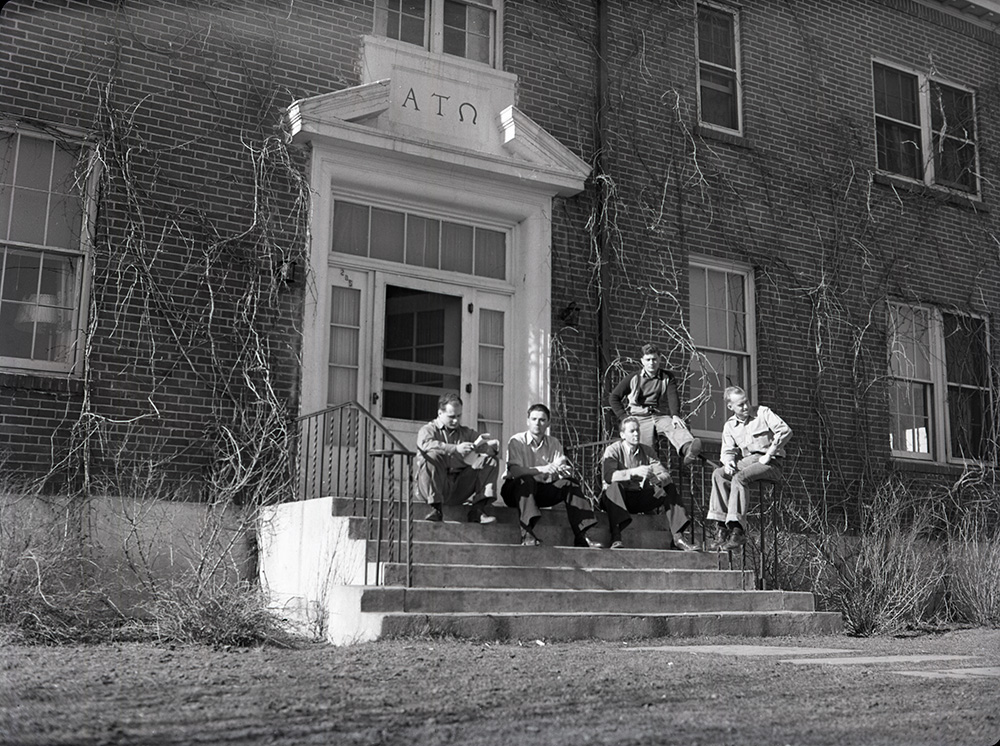 A porch with a view ID: 487 | This file appears in: Alpha Tau Omega Five unidentified students in front of the house, most likely in the 1950s. | Date: ca. 1950s | Source: University Archives, University of Nevada, Reno Libraries Download Original File SourceUniversity Archives, University of Nevada, Reno LibrariesDateca. 1950s "A porch with a view " appears in: Alpha Tau Omega