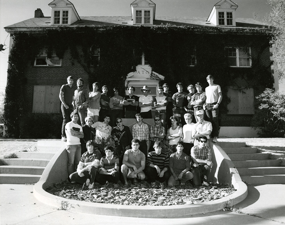Solemn-faced Alpha Tau Omega members stand in front of their house, which had recently been closed by the city for repairs.