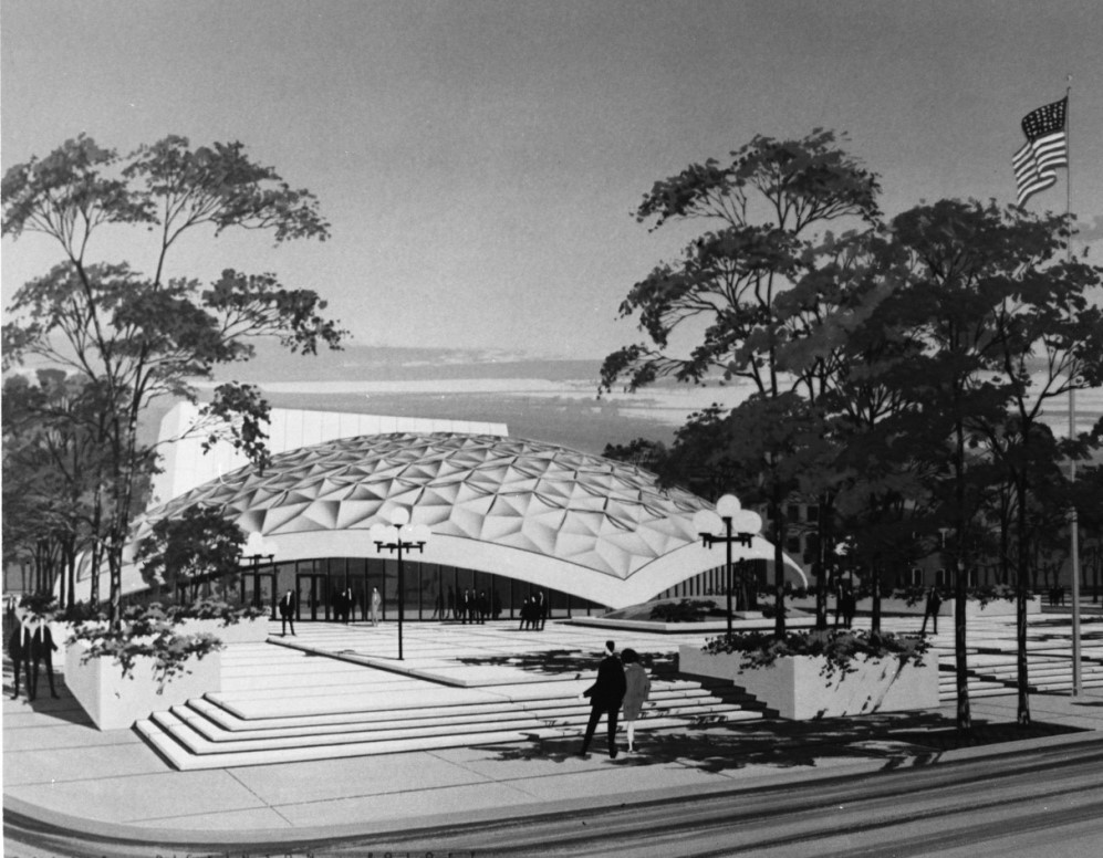 The geodesic dome was popularized by Richard Buckminster Fuller, who described it as an efficient and economical means to enclose a large space, based on his observation that the triangle is the strongest shape in nature. An architectural rendering was created in 1966 to show the community what the completed building would look like. | Creator: Bozalis, Dickinson, and Roloff | Date: 1966 Download Original File