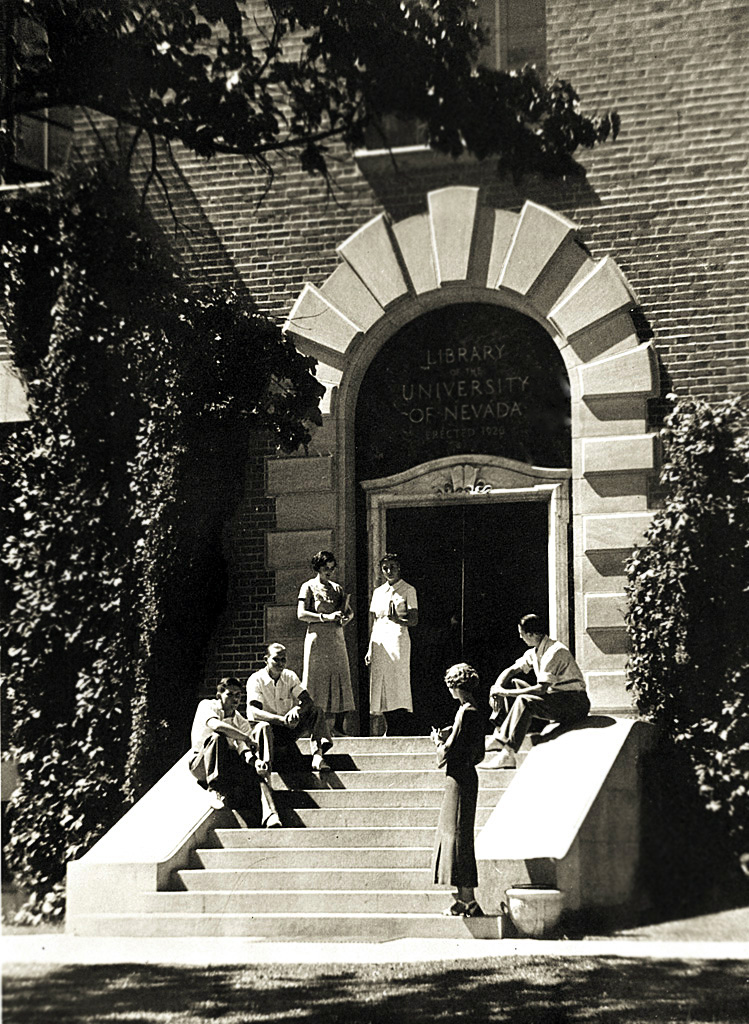 Campus, ca. 1936 ID: 511 | This file appears in: Clark Administration Building Students gather on the steps of the building in the 1930s. | Date: ca. 1936 | Source: University Archives, University of Nevada, Reno Libraries Download Original File SourceUniversity Archives, University of Nevada, Reno LibrariesDateca. 1936 "Campus, ca. 1936 " appears in: Clark Administration Building