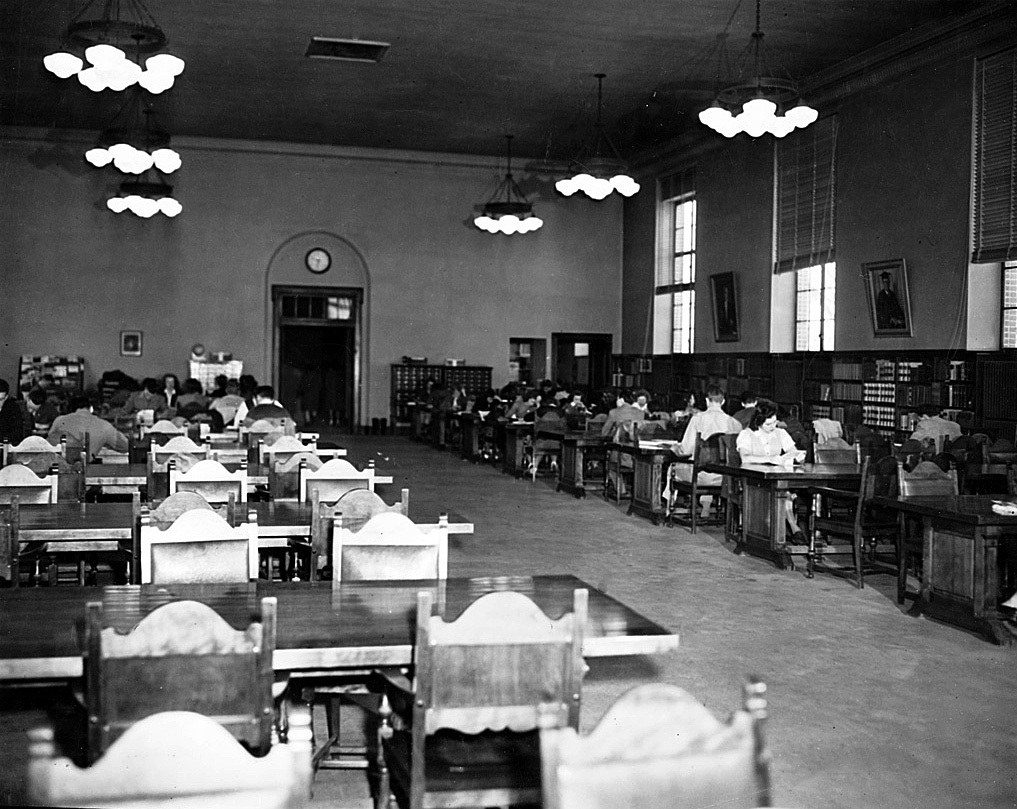 Students study at heavy wooden tables in the main reading room of the library around 1948.