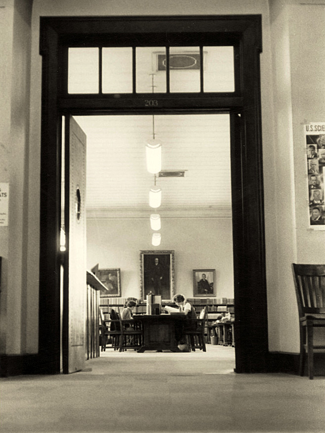 Portraits and bookshelves fill the walls of the library's interior reading room around 1960.