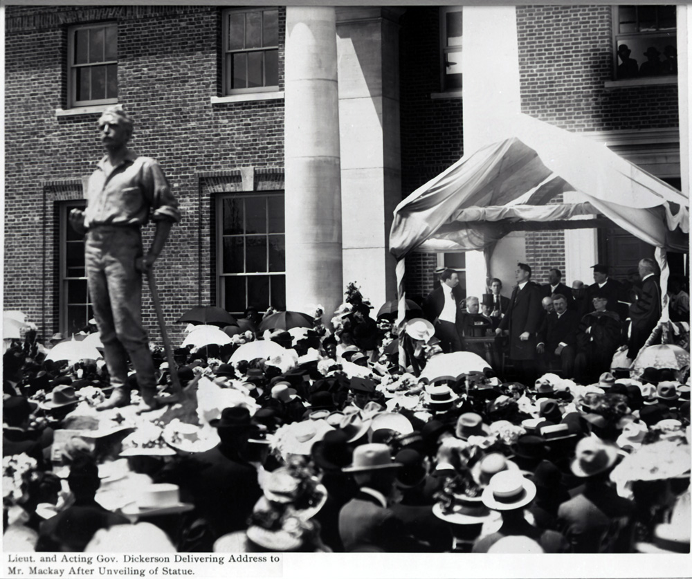 The dedication of the John Mackay statue and the Mackay School of Mines on June 10, 1908. Lieutenant and acting Governor Dickerson delivers the address to Clarence Mackay at the statue unveiling.