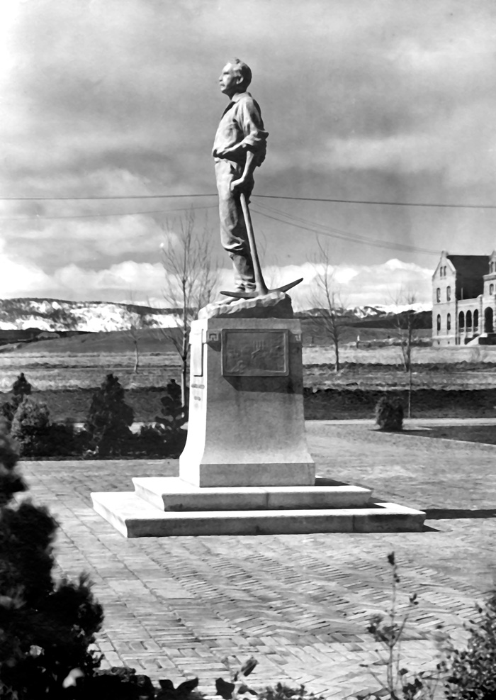 A 1911 photo of the statue in profile with Lincoln Hall and the snow-capped Sierra mountains in the distance to the west.
