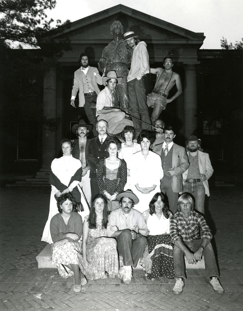 The Sagebrush staff in Mackay Days costumes pose in front of the statue in 1978.