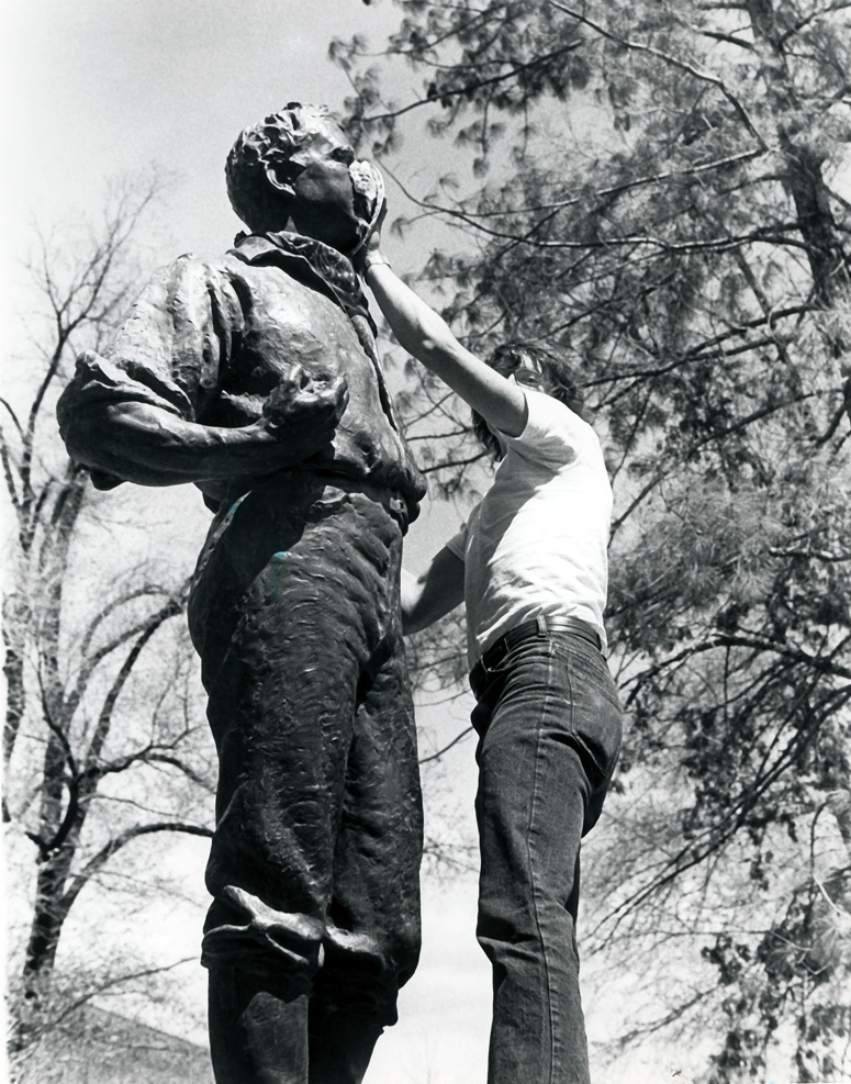A student has fun with the statue during the Mackay week celebration in 1979.