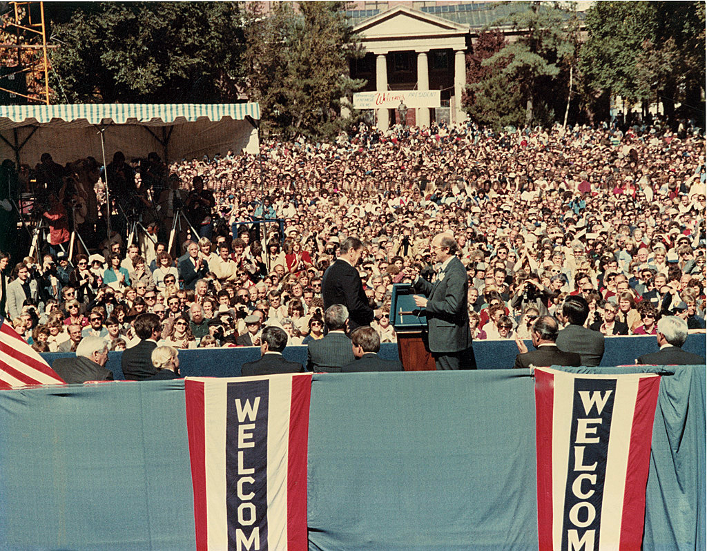 President Ronald Reagan visits the campus on October 7, 1982. He stands with University President Joseph Crowley at the podium. The audience waits on the Quadrangle, in front of the Mackay Statue and School of Mines building.