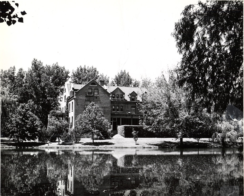 Manzanita Hall and trees reflected in Manzanita Lake in the sixties.
