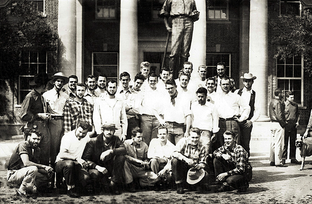 Sigma Alpha Epsilon fraternity pose in front of the Mackay Mines building for Mackay Week in 1950.