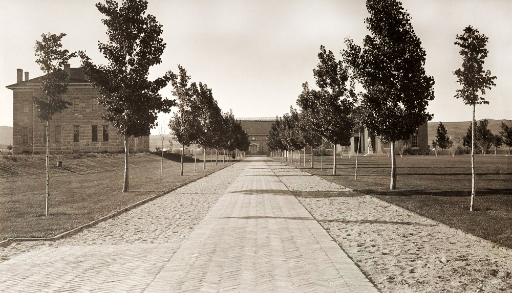 A 1908 view looking north with the Chemistry Building, historic Gymnasium, and School of Mines.