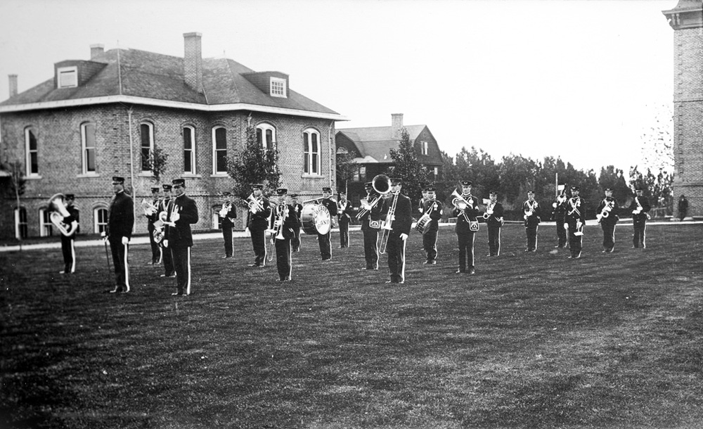 The Cadet Corps band on the quad in front of the President's House and the Agricultural Experiment Station in 1911.