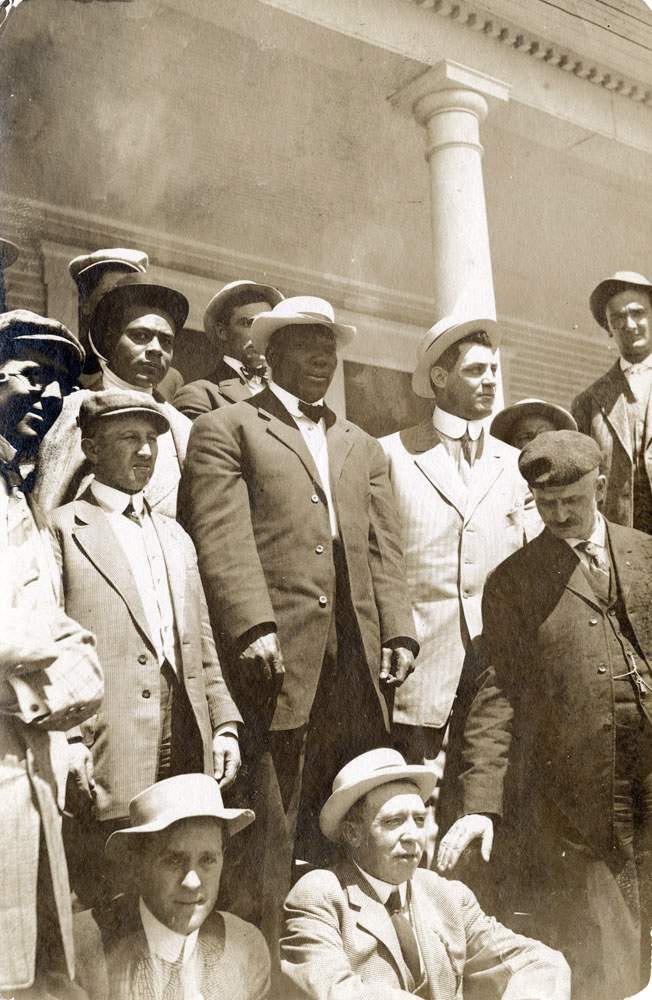 Fighter Jack Johnson and his entourage arrived in Reno by train on June 24, 1910, and were immediately driven to Rick's Resort where Johnson commenced his training for the "Fight of the Century" against Jim Jeffries on July fourth. | Date: 1910 | Source: Special Collections, University of Nevada, Reno Libraries Download Original File