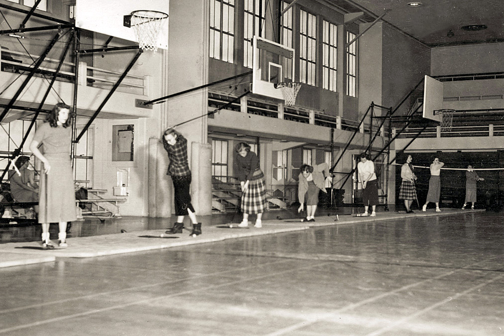 Golf class ID: 680 | This file appears in: Virginia Street Gymnasium Women's golf students in the Virginia Street Gymnasium, March 1949. | Date: 1949 | Source: University Archives, University of Nevada, Reno Libraries Download Original File SourceUniversity Archives, University of Nevada, Reno LibrariesDate1949 "Golf class" appears in: Virginia Street Gymnasium