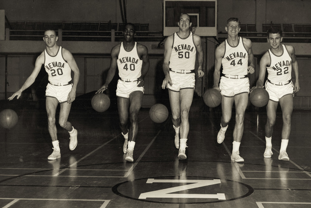 Members of the men's basketball team in 1965. From left to right: Eddie Johnson, Napoleon Montgomery, Bill Nicholson, Rene Ranson, and Captain Mike Olivas. | Date: 1965 | Source: University Archives, University of Nevada, Reno LibrariesDownload Original File