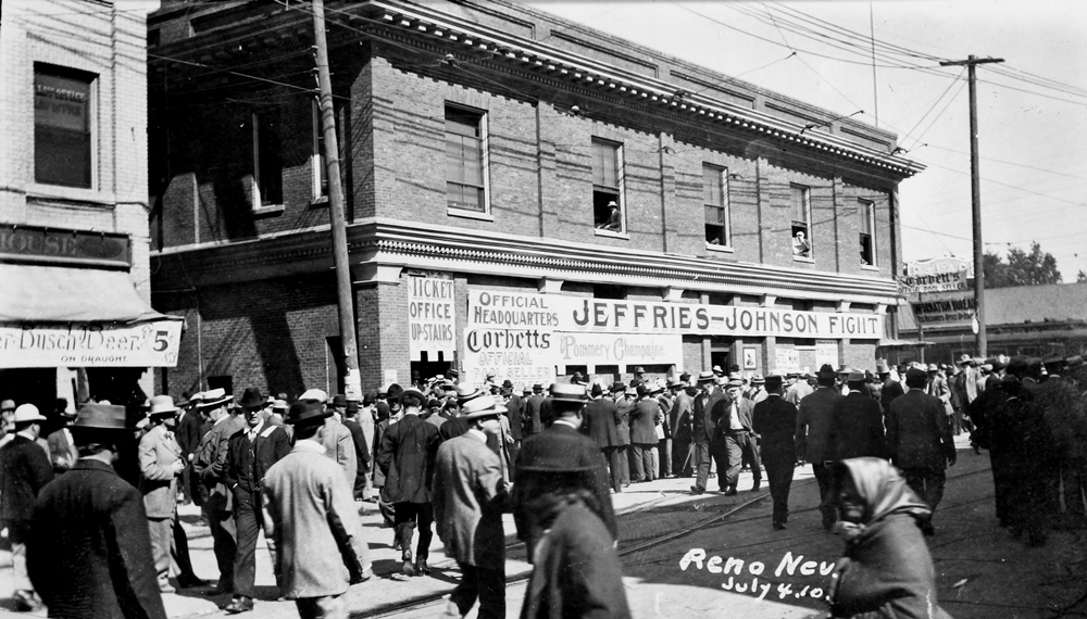 Fight Headquarters ID: 702 | This file appears in: Johnson-Jeffries Fight (site) Official headquarters for the fight was in downtown Reno, at the corner of Center Street and W. Commercial Row. | Date: 1910 | Source: Nevada Historical Society Download Original File SourceNevada Historical SocietyDate1910 "Fight Headquarters" appears in: Johnson-Jeffries Fight (site)