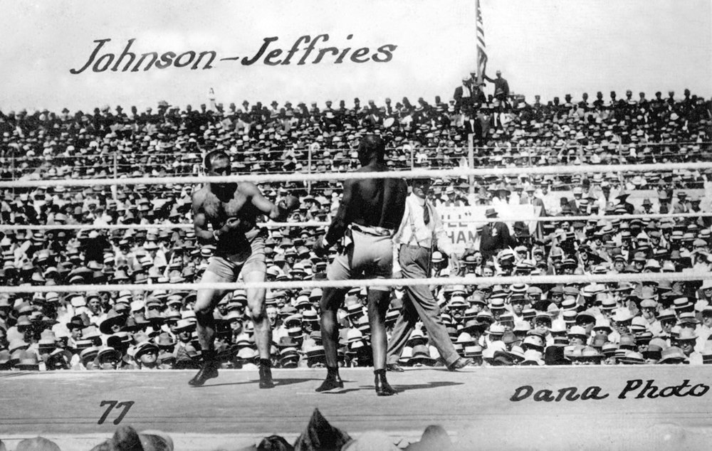 The crowd was riveted for fourteen full rounds. In the fifteenth round, Johnson knocked Jeffries down three times, prompting officials to call the fight before Jeffries could be knocked unconscious. | Date: 1910 | Source: Neal CobbDownload Original File