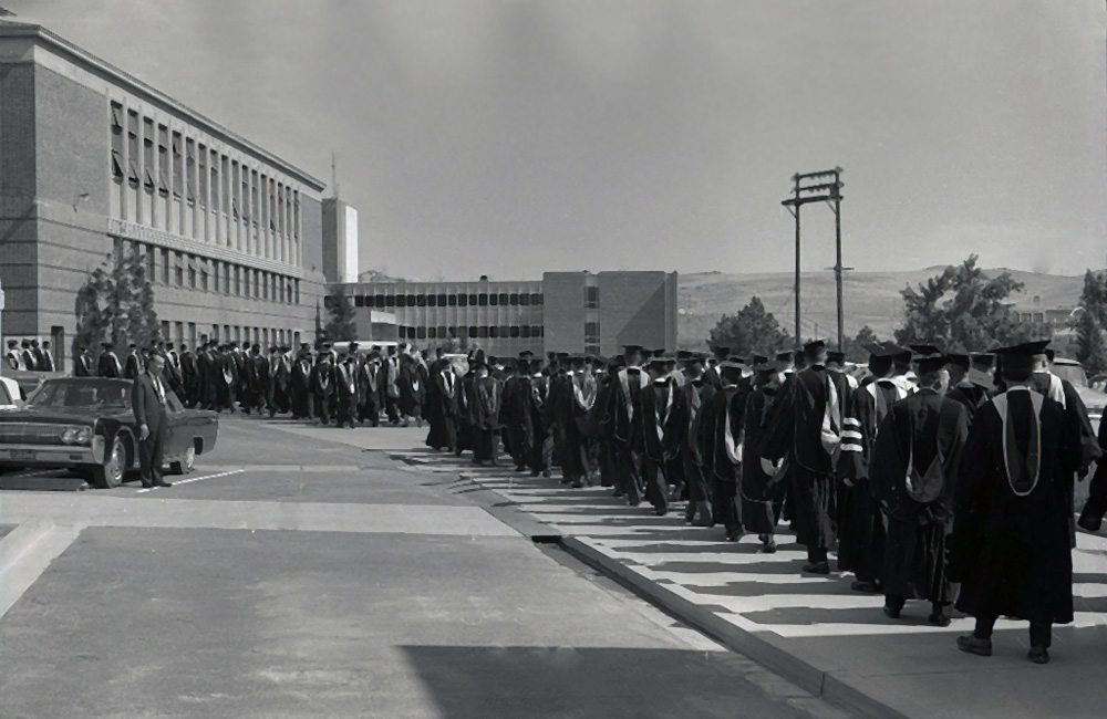 Faculty at Commencement ID: 776 | This file appears in: Virginia Street Gymnasium Faculty procession approaching the gymnasium for Commencement in 1964. | Date: 1964 | Source: University Archives, University of Nevada, Reno Libraries Download Original File SourceUniversity Archives, University of Nevada, Reno LibrariesDate1964 "Faculty at Commencement" appears in: Virginia Street Gymnasium