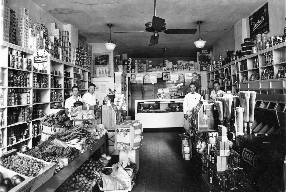 This photo is of the Reno Public Market, owned by the Pincolinis, who later opened Pinky's Market on E. 4th Street. From left to right, Vince Manfredi, Guido Pincolini, Mike (Manfredi?), Bruno Pincolini. | Date: 1940 | Source: University of Nevada Oral History ProgramDownload Original File