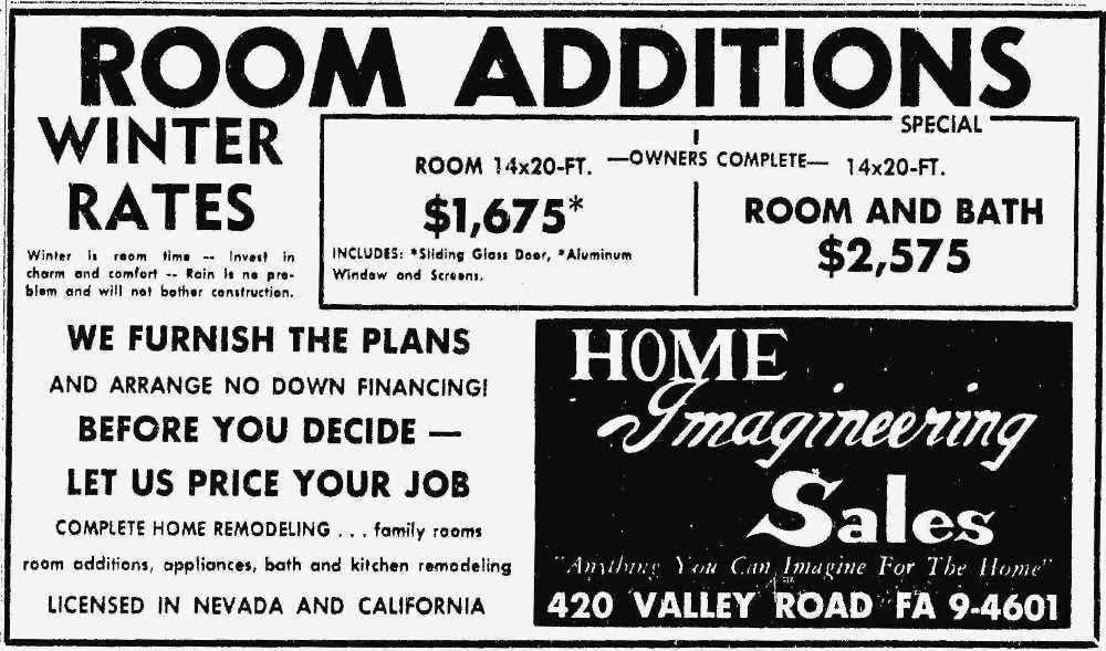 Home Imagineering ID: 837 | This file appears in: Zellerbach Paper Company A home remodeling company called Home Imagineering occupied the Zellerbach Paper building in the sixties. | Date: December 16, 1963 | Source: Reno Evening Gazette Download Original File SourceReno Evening GazetteDateDecember 16, 1963 "Home Imagineering" appears in: Zellerbach Paper Company