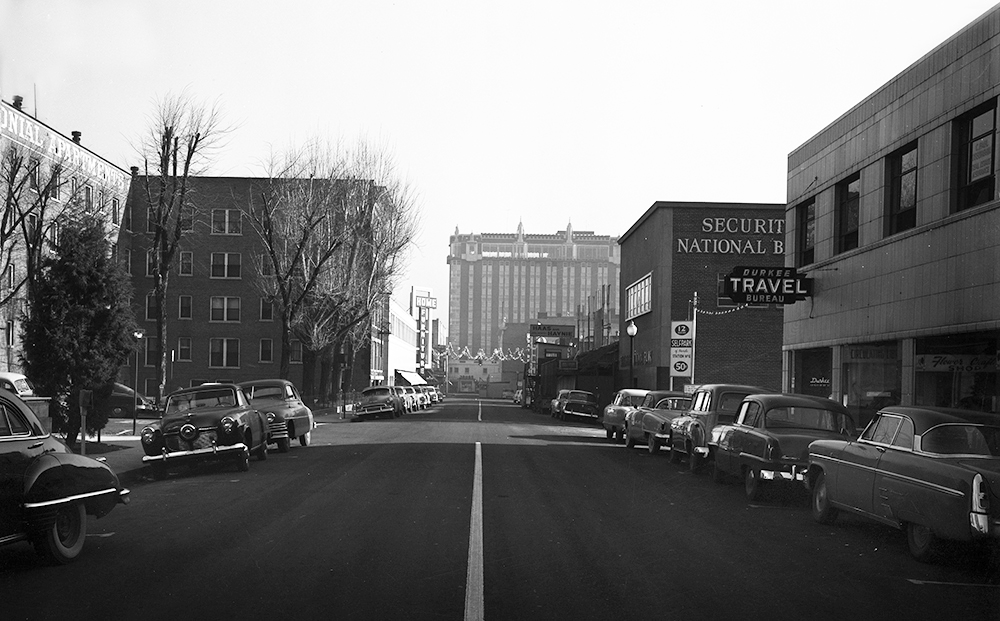 Looking eastward on First Street, the Hughes-Porter building can be seen on the right. Tenants at the time included the Durkee Travel Bureau. Straight ahead is the Mapes Hotel. To the left is the Colonial Apartments building.