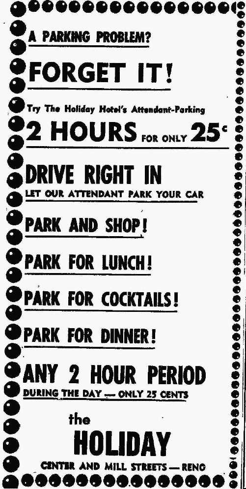 A newspaper ad from early 1957, just after the hotel's opening, touts the convenience of its on-site parking. Not included among the wide range of advertised amenities is gambling, which had not yet been added. | Date: January 11, 1957 | Source: Reno Evening GazetteDownload Original File
