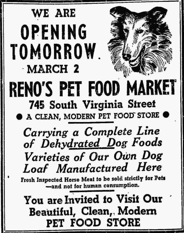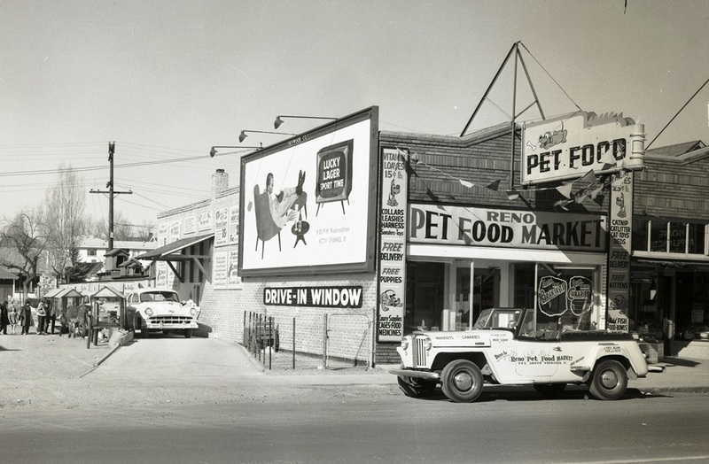 The Reno Pet Food Market opened at 745 South Virginia Street in the midst of the Second World War, as grain and meat rationing strained production for many pet food manufacturers. In response, the entrepreneurial Combs family cooked up a special vitamin loaf for cats and dogs from a recipe featuring wild horse meat, powdered milk, ground carrots, soy bean and corn meals, all cooked onsite in a giant steam pressure cooker. The full-service market also offered fresh cuts of meat, pet care products and accessories, free delivery, and even a drive-through window.