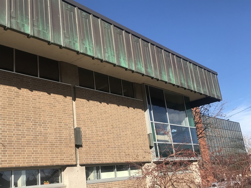 For the new City Hall, Wells designed a modern structure with a two-story open central atrium that originally featured a lush array of shrubs and trees said to create a "semi-tropical atmosphere." Large embossed, oxidized copper panels surround the interior atrium and cover the wide overhangs of the dramatic exterior roof line. The new building, constructed for a total cost of $1.3 million, was dedicated on May 21, 1965, with remarks from Governor Grant Sawyer, Reno Mayor Hugh Quilici, and others. The 67,000-square foot building served as the center of city government for the next four decades.