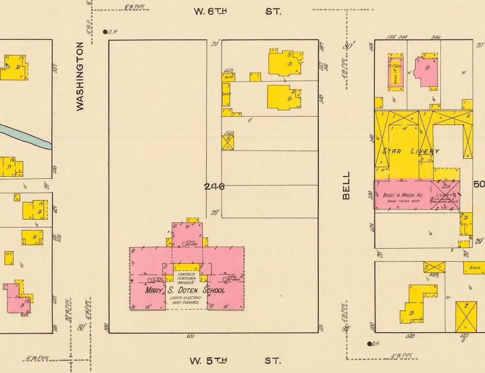 Mary S. Doten School served the students of northwest Reno for 60 years. The school was named for Mary S. Doten, a pioneer in Nevada education who had passed away in 1914. Doten began teaching in Reno in 1883, but before that, as a young woman, she had come to the Comstock boomtown of Virginia City from her home in Connecticut. There, she met the newspaperman Alf Doten, a friend of Mark Twain. Mary and Alf married in a romantic ceremony on a boat in Lake Tahoe in 1873.