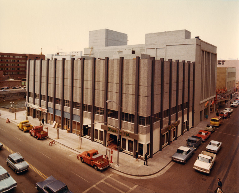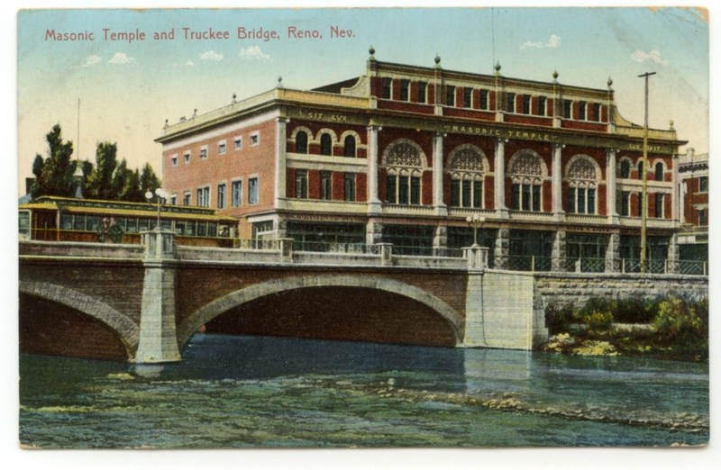 By 1905, the old Masonic Hall on Commercial Row was no longer adequate for the growing membership and responsibilities of Reno Masonic Lodge No. 13. The new building commanded a prominent position at the northwest corner of the new Virginia Street Bridge, formerly the site of a livery stable. It was yet another expression of Reno’s growing maturity. The officers of the Grand Lodge of the State of Nevada placed the cornerstone on the building on September 16, 1905. The Temple was an elaborate two-tone, three-story Romanesque structure. The members must have swelled with price when they attended their first meeting on December 8, 1906. In addition to serving as the Masonic Temple, the building housed retail stores on the ground floor. A four-story expansion wing facing West First Street, designed by architect Russell Mills, was completed in 1955.