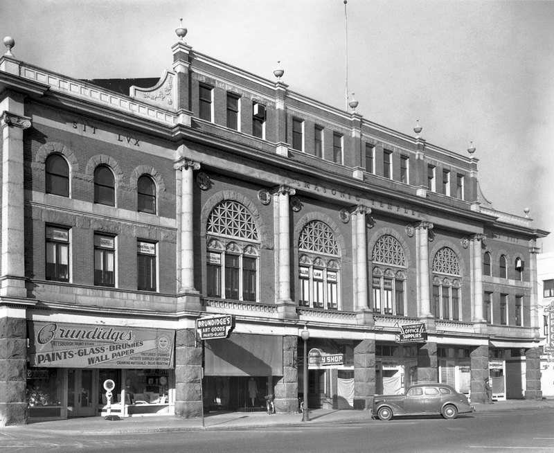 The modern 1967 Masonic Lodge stands on the same site as the earlier 1906 Temple lost to fire.