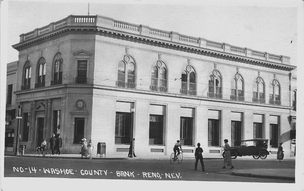 After it became the Washoe County Bank, the owners remodeled the building, replacing the ornate Italianate brackets and detailing, giving the building a more refined and dignified look of the Renaissance Revival style. | Source: Dick DreilingDownload Original File