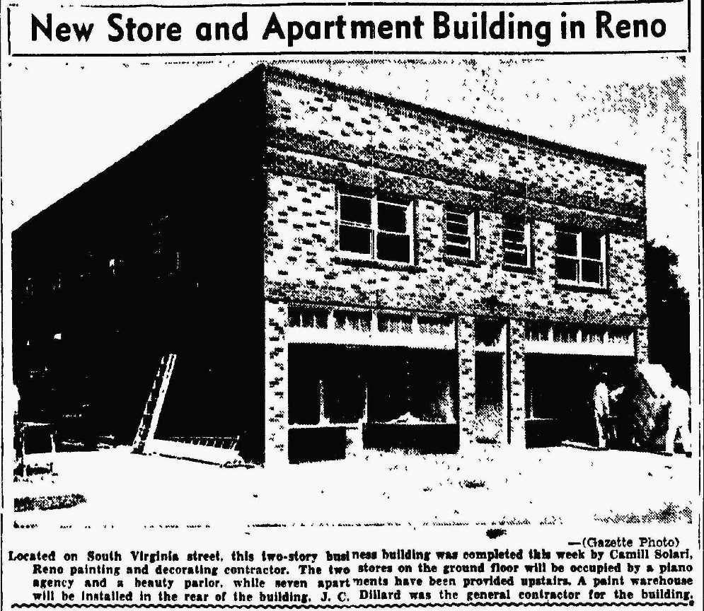 The new building ID: 1042 | This file appears in: Solari Building A newspaper article in July 1938 announced the new store and apartment building and some of its original tenants, a "piano agency" and beauty parlor. | Date: July 30, 1938 | Source: Reno Evening Gazette Download Original File SourceReno Evening GazetteDateJuly 30, 1938 "The new building" appears in: Solari Building