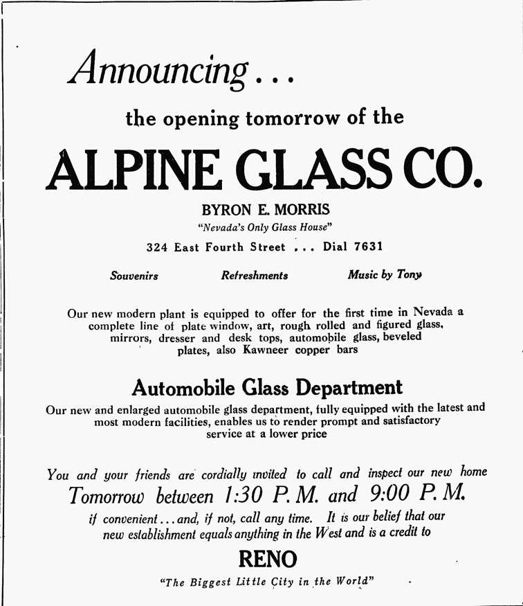 On August 24, 1929, Byron Morris announced the new location for the Alpine Glass Company, at 324 East 4th Street. The new warehouse was designed by prominent Nevada architect Frederic DeLongchamps. | Date: August 23, 1929 | Source: Reno Evening GazetteDownload Original File