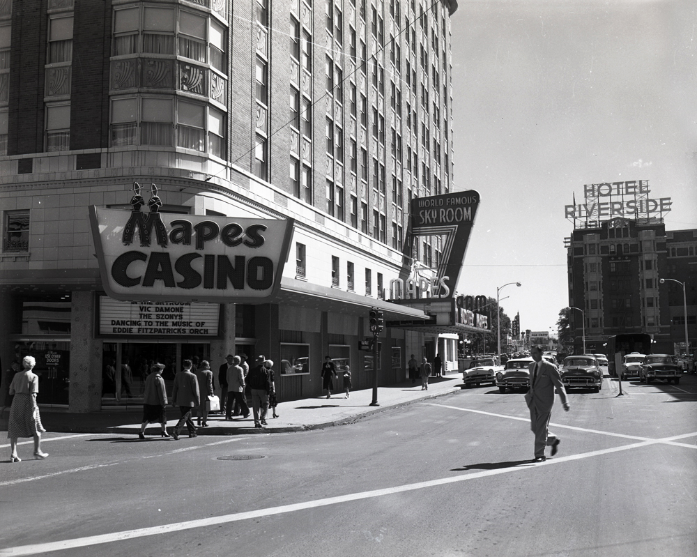 The Mapes Hotel logo, appearing on the outside of the building as well as on promotional materials and key chains, featured two cowboys standing side by side with legs akimbo, forming the “M” for Mapes. | Source: Special Collections, University of Nevada, Reno LibrariesDownload Original File