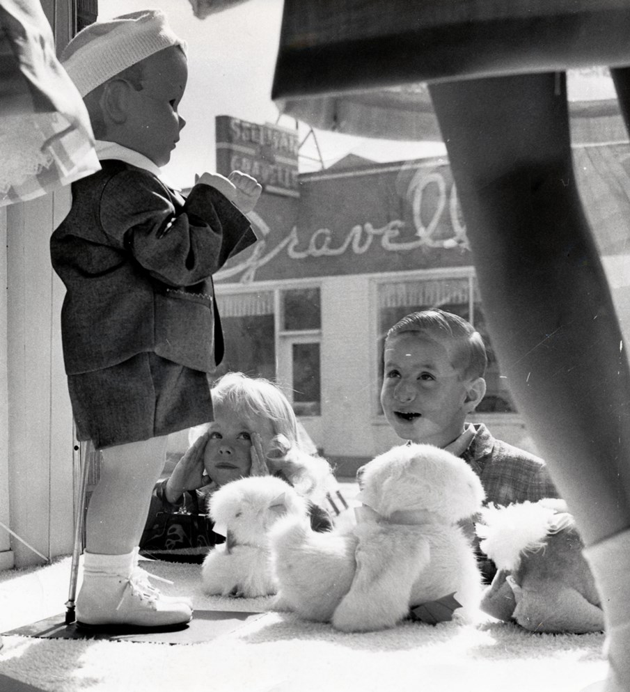 Seen from the interior of the Hansel & Gretel Children's Clothing Store is Interiors by Gravelle, a fixture at 1049 South Virginia Street for more than three decades. Posing for a photo feature in the Reno Evening Gazette are Allison Brown and Barry O'Sullivan. | Date: ca. 1965 | Source: Barry O'SullivanDownload Original File