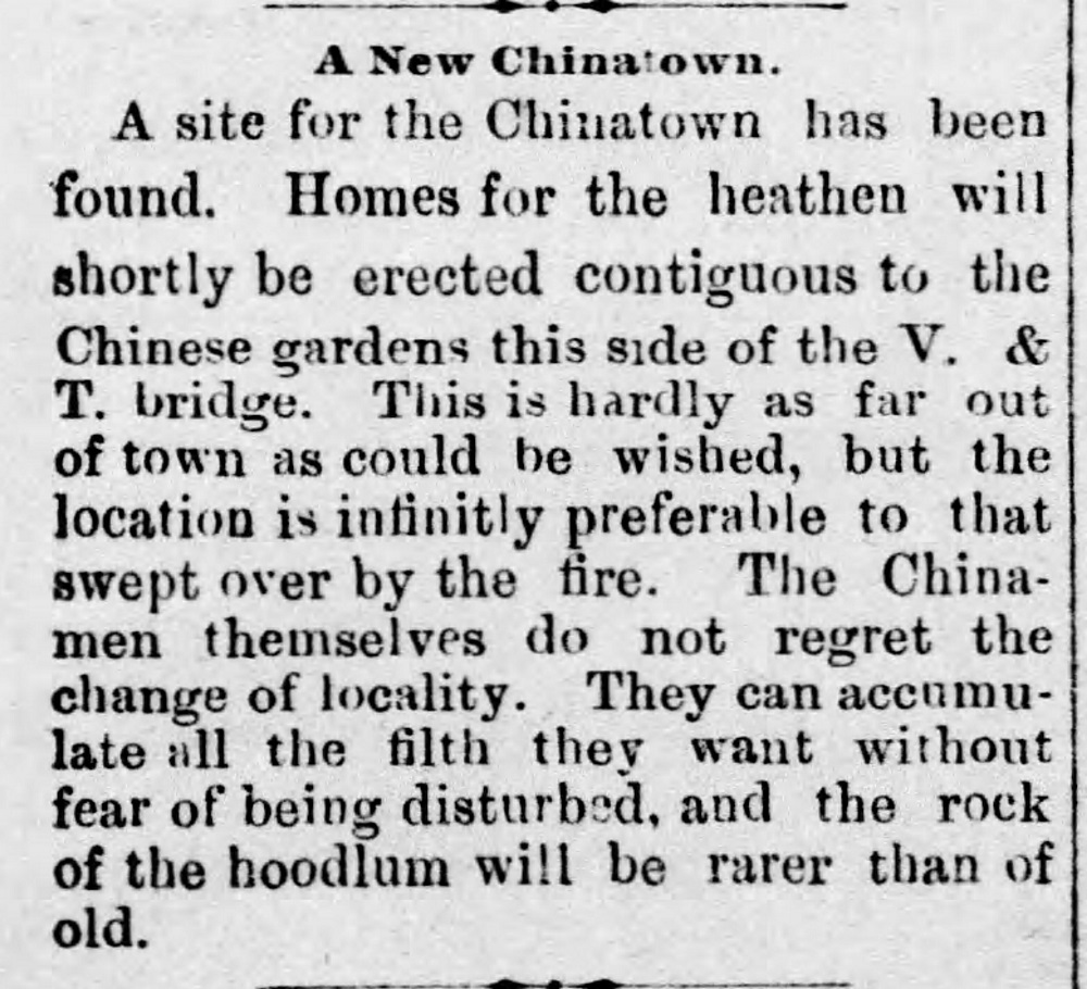 After a massive fire burned down the original Chinatown, located near Virginia Street along the river, a deeply prejudiced article published in the Reno Evening Gazette on August 2, 1878 discussed the construction of a new Chinatown further east.