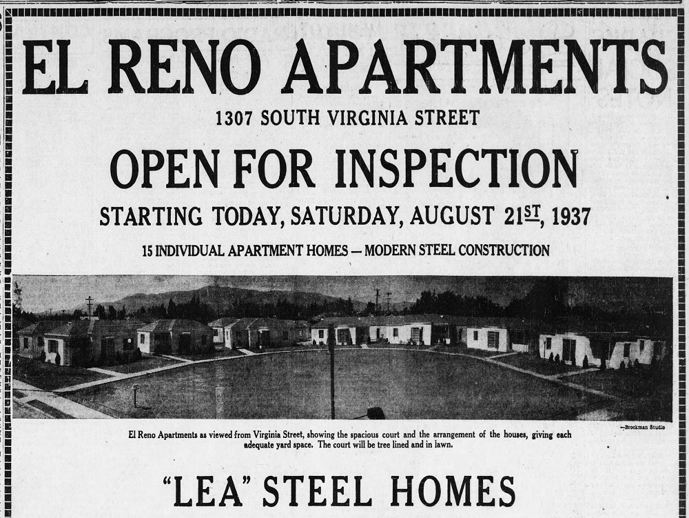 An advertisement published in the Reno Evening Gazette on August 21, 1937 invites the public to inspect the new El Reno Apartments, and depicts their original arrangement as viewed from South Virginia Street. | Date: 1937 | Source: Reno Evening GazetteDownload Original File