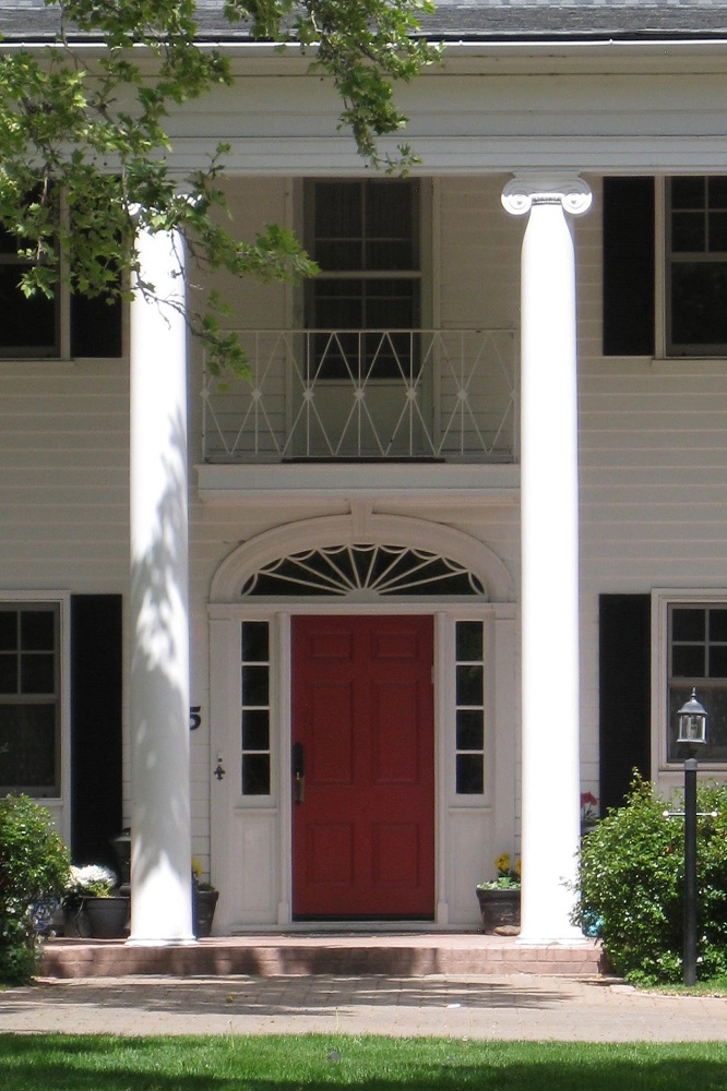 The front entry has a large open portico with tall Doric columns topped with volutes (spiral scroll-like ornaments). The red door is flanked with sidelights and topped with a beautiful fanlight. | Creator: Donna and Paul EricksonDownload Original File
