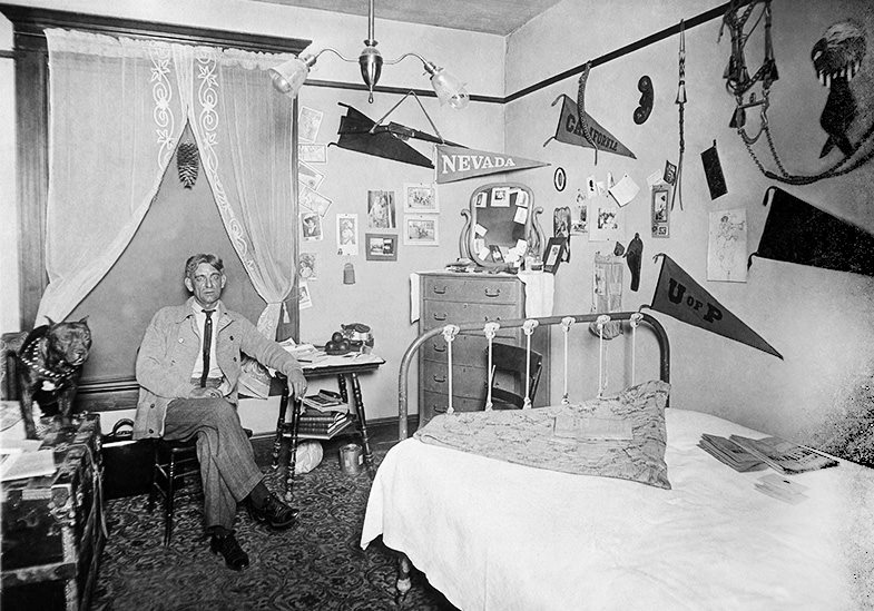 A photograph identifies the subject as Charles D. Martin, who lived in room 24 of the St. Albans Hotel in 1912. The intriguing photo depicts numerous collegiate banners including that of Nevada, multiple pin-up posters, and a dog.