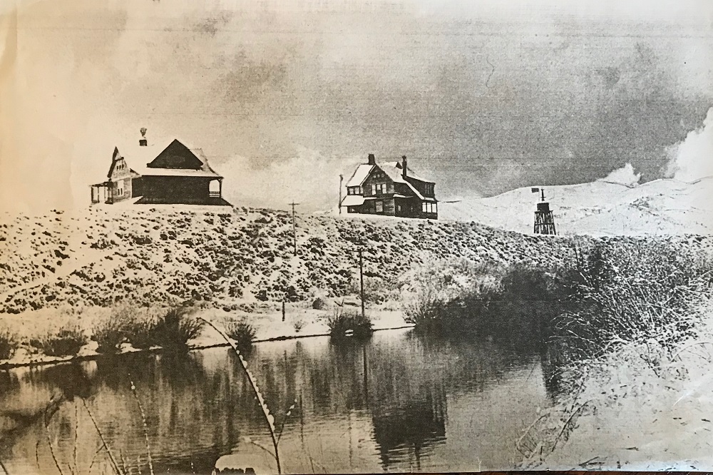 Newlands houses on the bluff ID: 1574 | This file appears in: Francis G. Newlands Office In this early photograph looking southward toward the bluff from the north bank of the Truckee River, the Newlands House is on the right and the Newlands Office on the left. | Source: Renate Neumann Download Original File SourceRenate Neumann "Newlands houses on the bluff" appears in: Francis G. Newlands Office