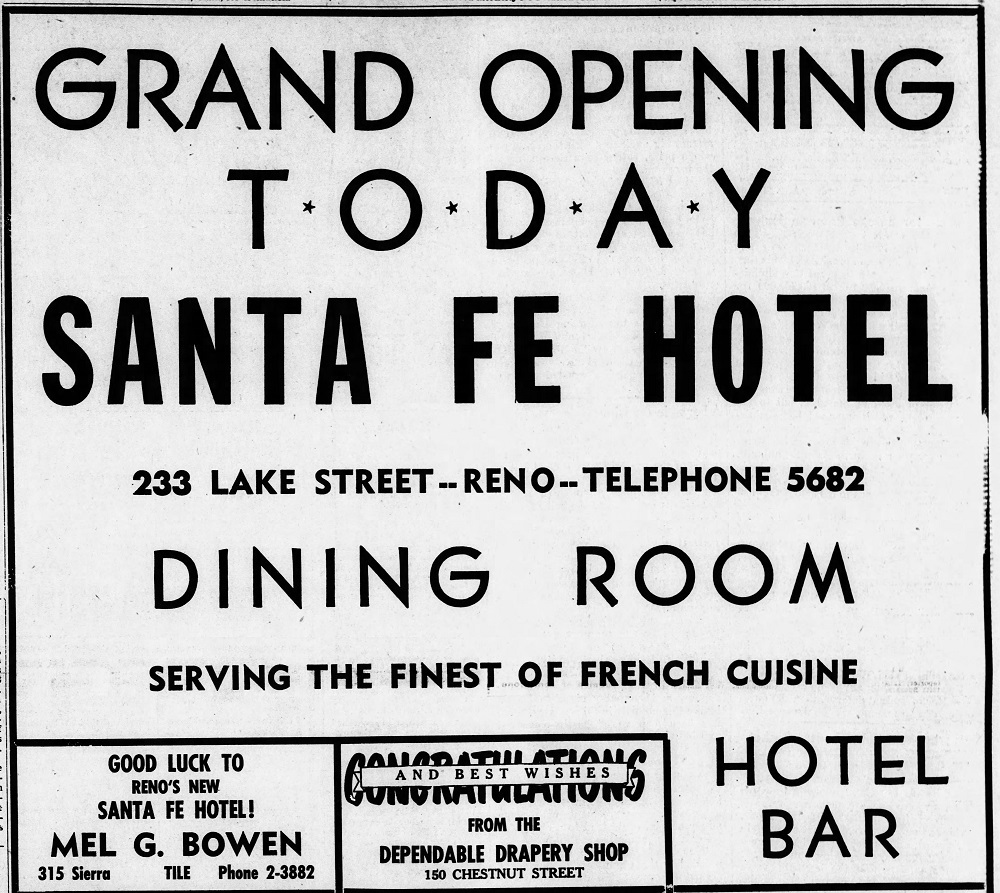 Grand Opening, 1949 ID: 1669 | This file appears in: Santa Fe Hotel A newspaper advertisement announced the grand opening of the new building. The reference to "French cuisine" reflected the Basque culinary tradition. | Date: August 20, 1949 | Source: Reno Evening Gazette Download Original File SourceReno Evening GazetteDateAugust 20, 1949 "Grand Opening, 1949" appears in: Santa Fe Hotel