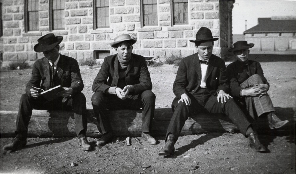 Chemistry students Frederick Charles Nimis, Silas Ross, Edwin Howard Coffin, and Winfield Scott Lake sit in front of the Chemistry Building in 1906. The historic Chemistry Building, built in 1902, was located where Ross Hall currently stands today. The Agriculture Extension Service later occupied the building and renamed it the Extension Building. It was demolished in 1957. | Date: 1906 | Source: University Archives, University of Nevada, Reno LibrariesDownload Original File