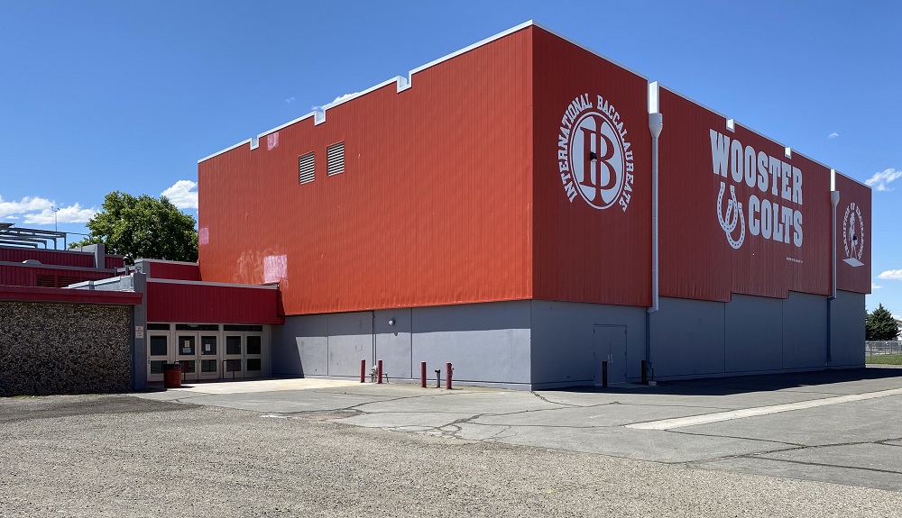 The gymnasium makes a bold statement in the school's official colors of scarlet and white. At 40,000 square feet, it opened with a seating capacity of 1,500 for games and a maximum seating of 2,400. The building also included boys and girls shower and locker rooms, stage and lobby areas used for teacher stations, and a music rehearsal room. | Creator: Sharon Honig-Bear | Date: 2020Download Original File
