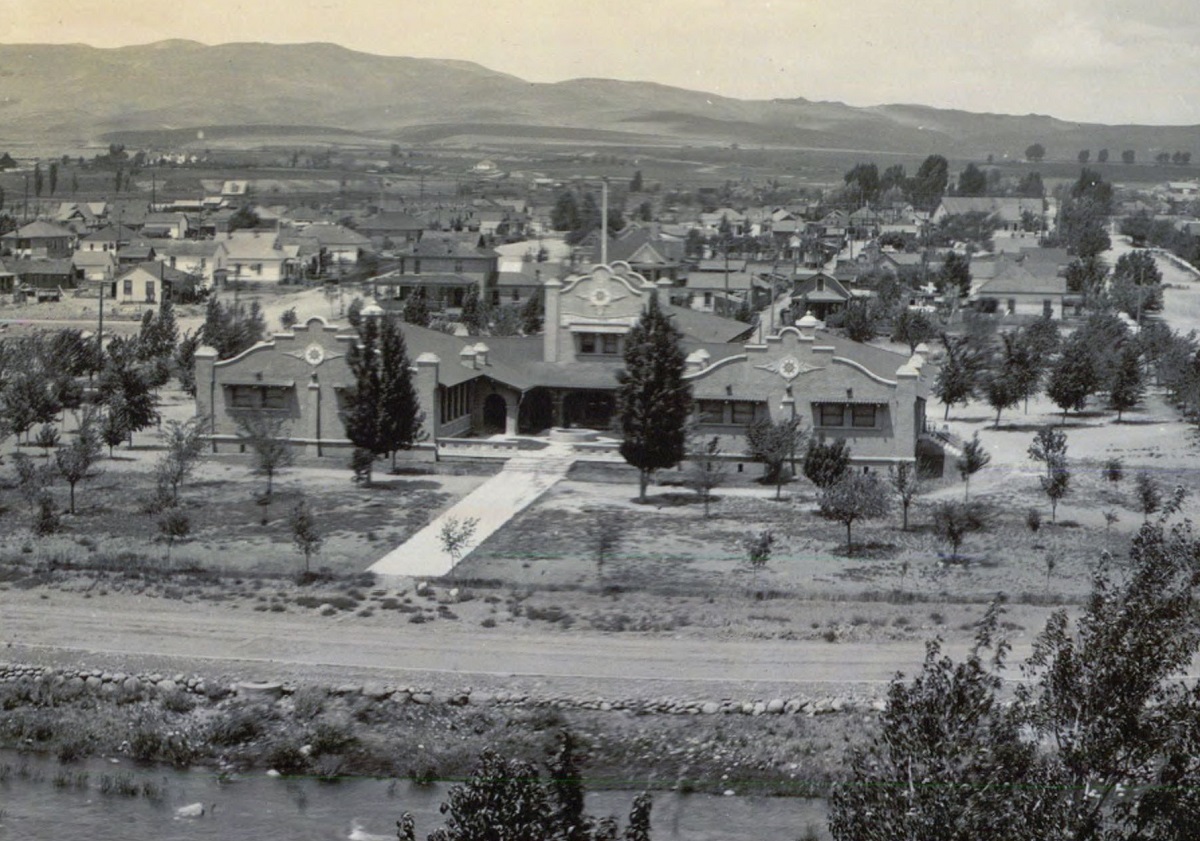 A detail from an early panoramic view of Riverside Drive shows the new McKinley Park School with its new landscaping and fresh pavement. | Creator: T.H. Wohlbruck | Source: Special Collections, University of Nevada, Reno LibrariesDownload Original File