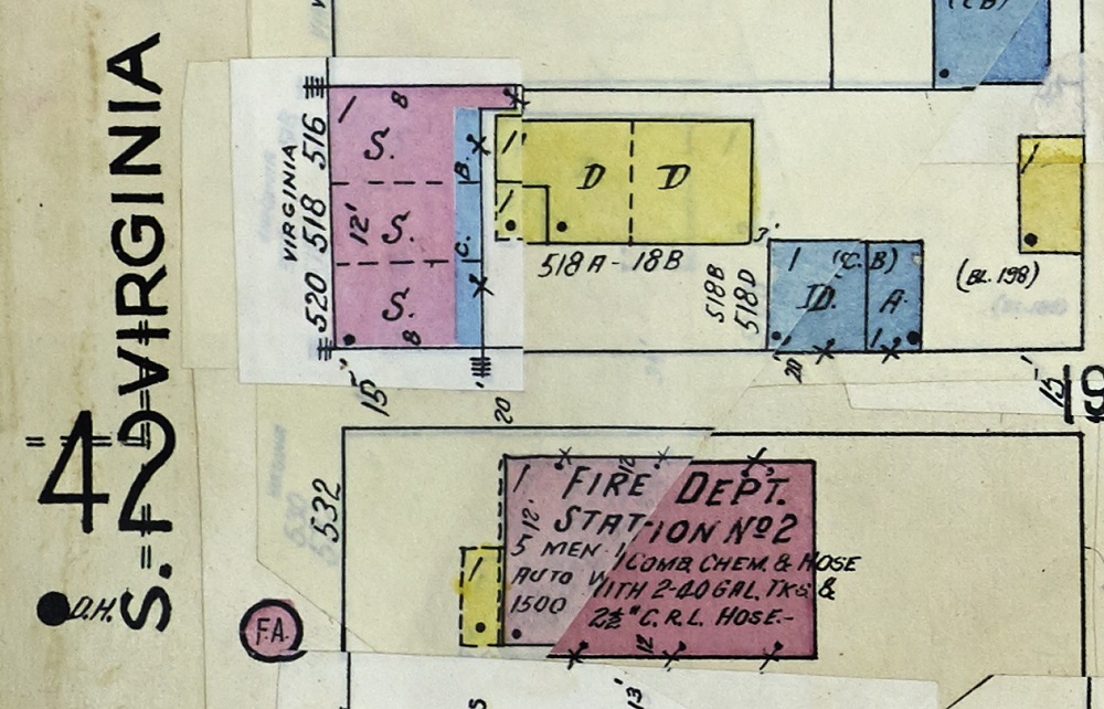 The 1949 Sanborn Fire Insurance Map of Reno clearly shows the three storefronts--516, 518, and 520--as well as the house that stood directly behind the building for many years. The building materials are color-coded: pink for brick, yellow for wood frame, and blue for stone. The Southside Fire Station, which once stood directly to the south, is no longer standing. | Creator: Sanborn Fire Insurance Company | Date: 1949 | Source: U.S. Library of CongressDownload Original File
