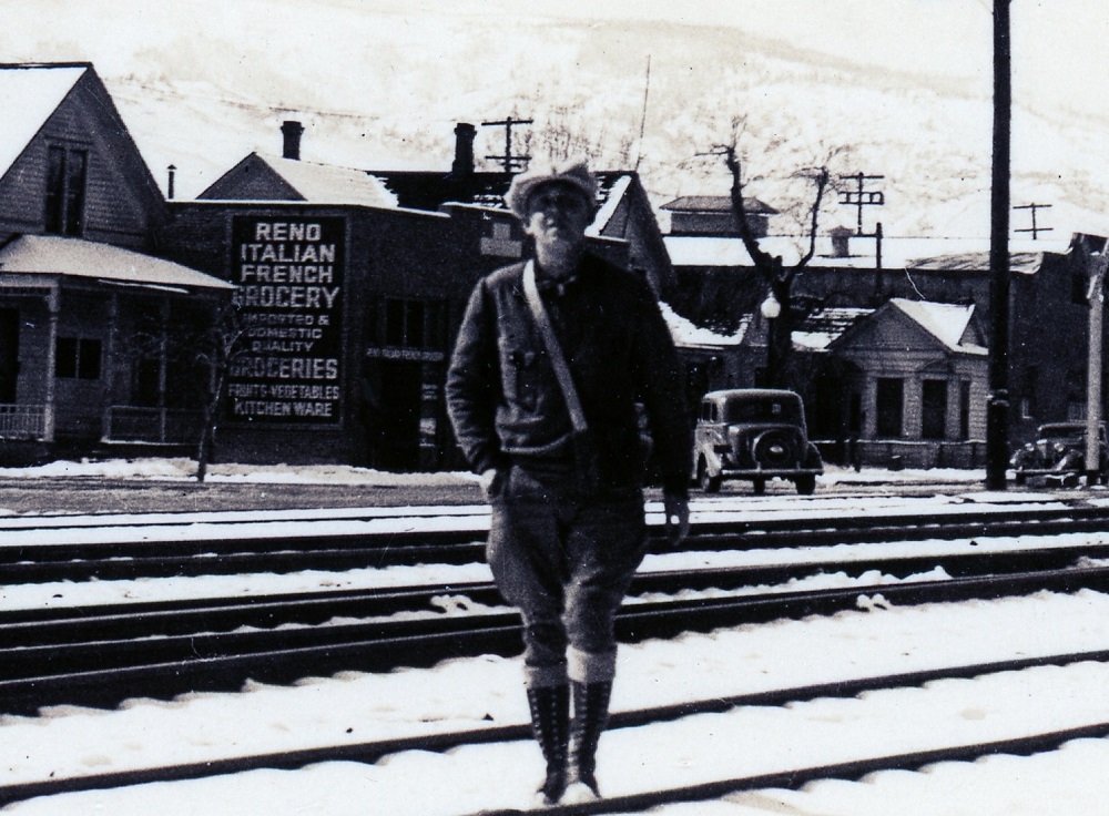 The DeGiacoma Building on West Commercial Row housed Paul and Rose DeGiacoma's Reno Italian French Grocery. The name was painted on the side of the building to be more easily viewed from the business district to the east, as seen in this 1936 photograph looking south over the railroad tracks. | Date: 1936 | Source: Hagen Sandoval Collection, This Side of RenoDownload Original File