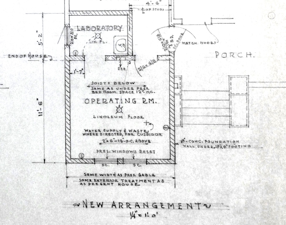 The floor plan for the new addition designed by DeLongchamps and O'Brien depicts the new "operating room" and "laboratory" for Dr. Carr's new dentist's office, complete with a linoleum floor and water supply for the "cuspidor."