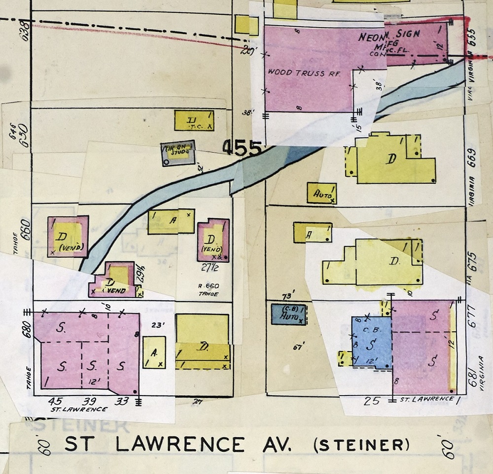 The 1949 Sanborn Fire Insurance map of the block shows the Carr House in yellow (signifying wood frame) on the right, just below the Cochran Irrigation Ditch that ran to its north. Depicted in pink, for brick, are a neon sign factory and commercial buildings on Virginia Street and St. Lawrence Avenue. | Creator: Sanborn Fire Insurance Company | Date: 1949 | Source: U.S. Library of CongressDownload Original File